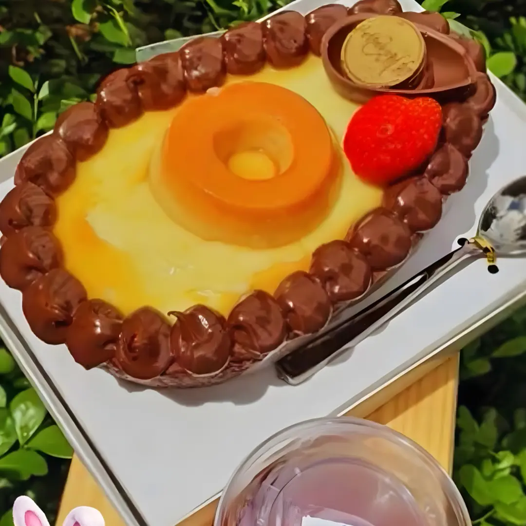 Recheado com um pudim cremoso e irresistível, cada colherada entrega textura leve e aquele sabor caseiro que remete às melhores lembranças. Para finalizar, o ovo acompanha um pudim individual por cima, tornando a experiência ainda mais especial e visualmente encantadora.